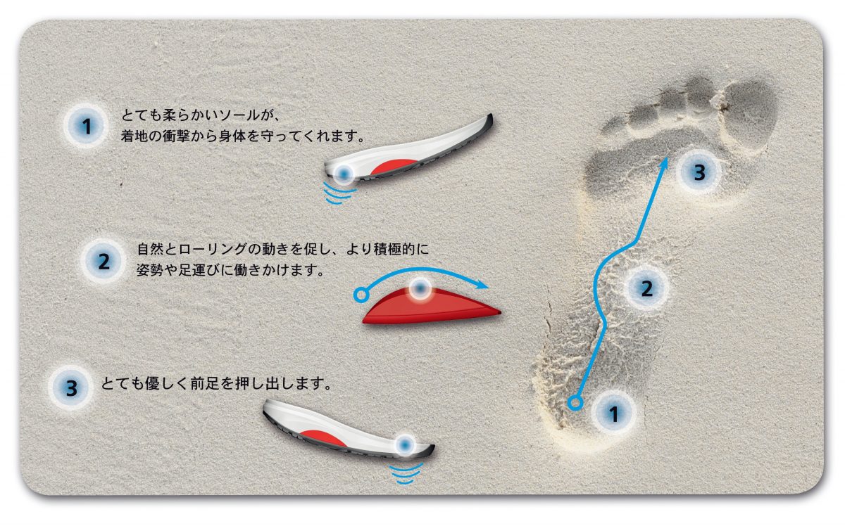 以下のような独自技術によって、先ほど紹介した靴選びのポイントをすべて解決し、足への負担を最小限にしながら歩行をサポートしてくれます。