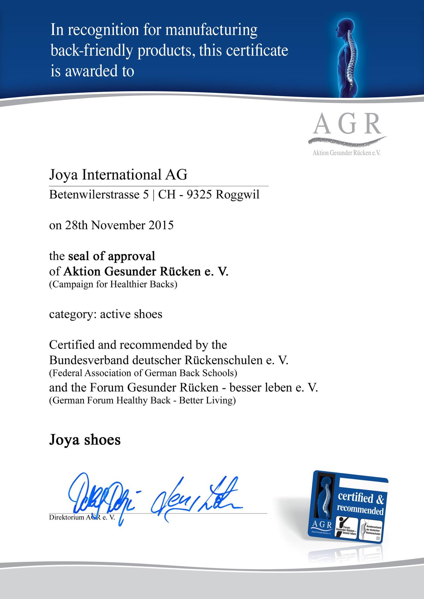 「Aktion Gesunder Rucken」(省略してAGR)(脊椎健康推進協会)はJoyaにAGR品質ラベルを与え、特に脊椎に優しい製品として推奨します。